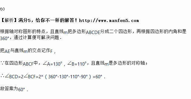 如图,五边形ABCDE是关于直线FC的轴对称图形,若∠A=130°,∠B=110°,则∠BCD= ____度.
