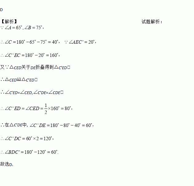 如图,在三角形纸片ABC中,∠A=65º,∠B=75º,将纸片的一角折叠(折痕为DE),使点C落在△ABC内的C′处,若∠AEC′=20º,则∠BDC′的度数是( )