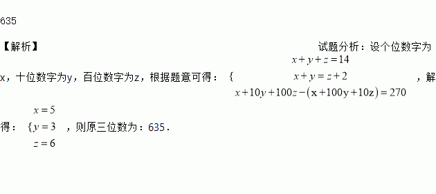 一个三位数的各位数字之和等于14,个位数字与十位数字的和比百位数字大2,如果把百位数字与十位数字对调,所得新数比原数小270,则原三位数为______.