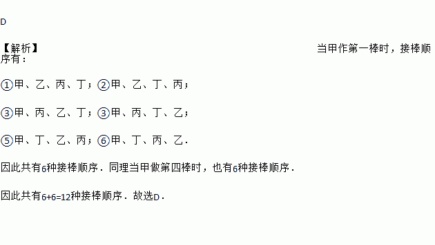 甲、乙、丙、丁四名运动员参加4×100米接力赛,甲必须为第一接力棒或第四接力棒的运动员,那么这四名运动员在比赛过程的接棒顺序有( )