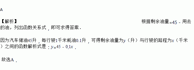 有一辆汽车储油45升,从某地出发后,每行驶1千米耗油0.1升,如果设剩余油量为y(升),行驶的路程为x(千米),则y与x的关系式为( )