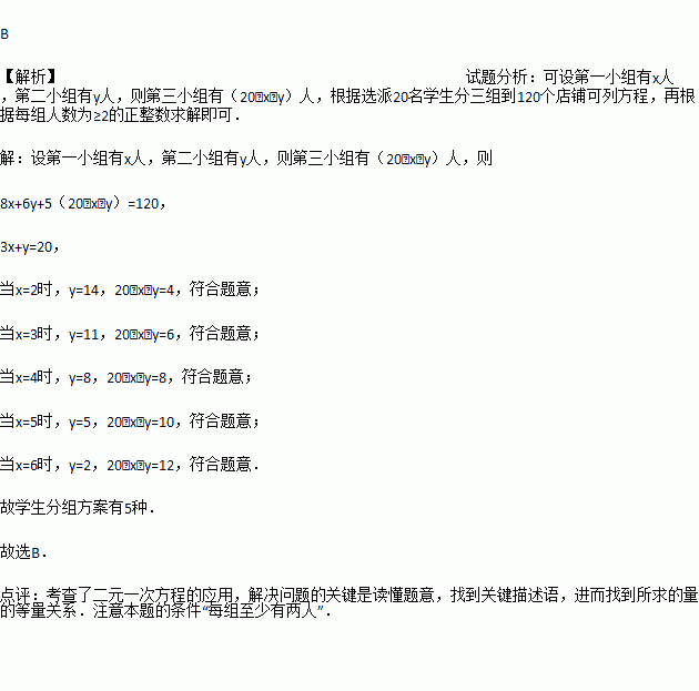 某校团委与社区联合举办“保护地球,人人有责”活动,选派20名学生分三组到120个店铺发传单,若第一、二、三小组每人分别负责8、6、5个店铺,且每组至少有两人,则学生分组方案有【 】