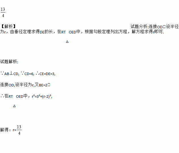 如图所示,在⊙O中直径AB垂直于弦CD,垂足为E,若BE=2,CD=6.求⊙O的半径.