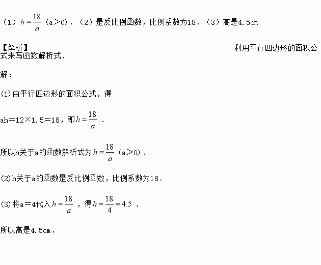已知某平行四边形的面积一定,当该平行四边形的底边a=12cm时,这条边上的高h=1.5cm.