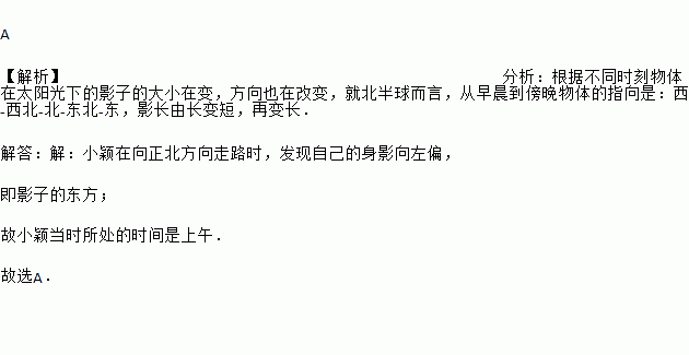 在一个晴朗的天气里,小颖在向正北方向走路时,发现自己的身影向左偏,你知道小颖当时所处的时间是( )