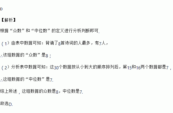 那么这30名同学四月份诗词背诵数量的众数和中位数分别是![]()