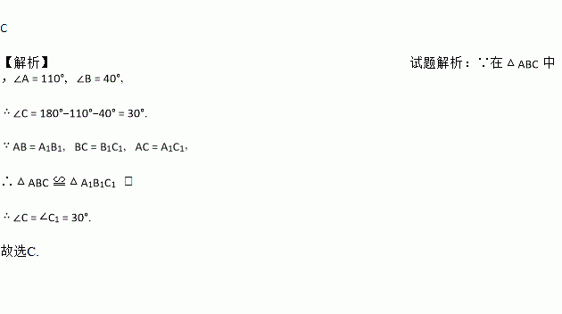 如图,AB=A1B1,BC=B1C1,AC=A1C1,且∠A=110°,∠B=40°,则∠C1=( )