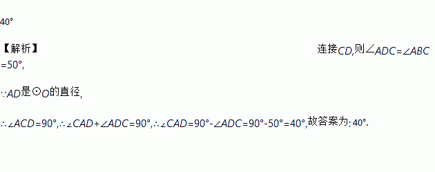 如图,△ABC是⊙O的内接三角形,AD是⊙O的直径,∠ABC=50°,则∠CAD=________ .