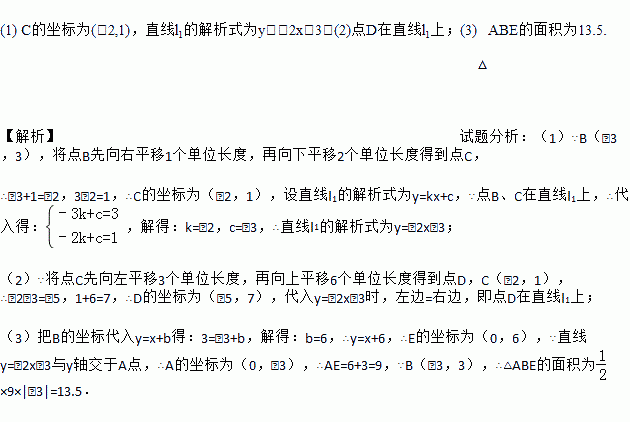 (2)若将点C先向左平移3个单位长度,再向上平移6个单位长度得到点D,请你判断点D是否在直线l1上;