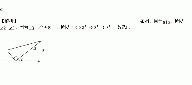 如图,a∥b,含30°角的三角板的直角顶点在直线b上,一个锐角的顶点在直线a上,若∠1=20°,则∠2的度数是( )