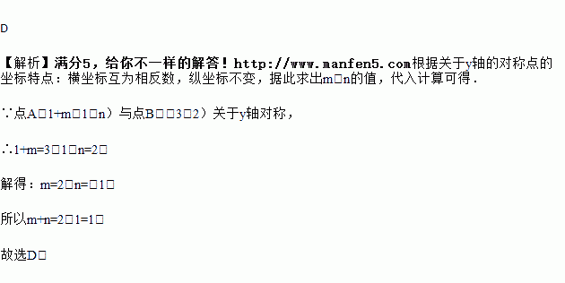 若点A(1+m,1﹣n)与点B(﹣3,2)关于y轴对称,则m+n的值是( )
