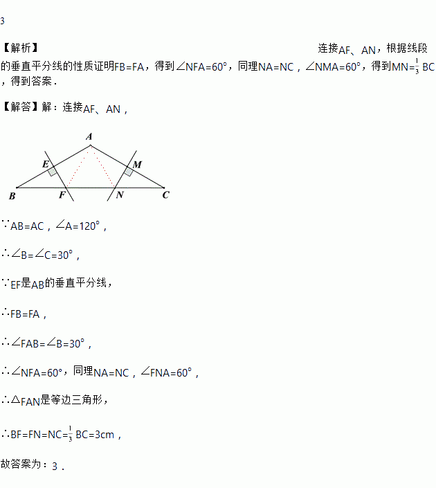 在△ABC中,AB=AC,BC=9cm,∠A=120°,AB的垂直平分线交AB于E,交BC于F,AC的垂直平分线交AC于M,交BC于N,则FN的长为__cm.
