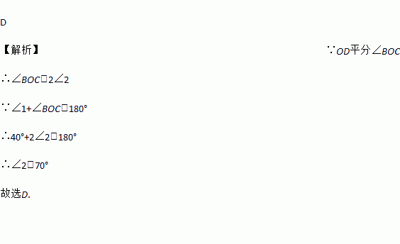 如图(三)所示,已知O是直线AB上一点,∠1=40°,OD平分∠BOC,则∠2的度数是