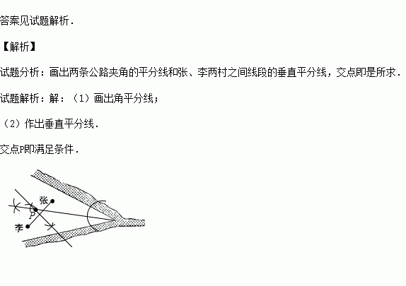 近年来,国家实施“村村通”工程和农村医疗卫生改革,某县计划在张村、李村之间建一座定点医疗站P,张、李两村座落在两相交公路内(如图所示).医疗站必须满足下列条件:①使其到两公路距离相等;②到张、李两村的距离也相等.请你通过作图确定P点的位置.