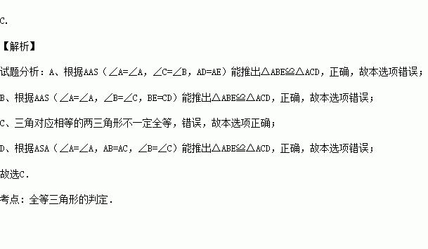 A.AD=AE B.BE=CD C.∠AEB=∠ADC D.AB=AC