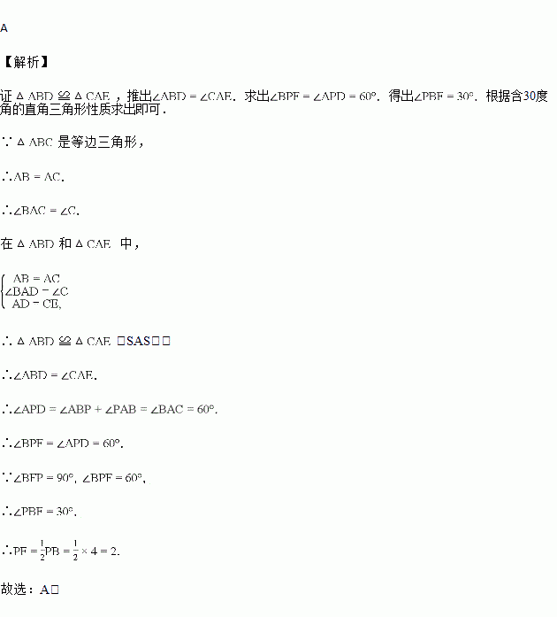 如图,△ABC为等边三角形,D、E分别是AC、BC上的点,且AD=CE,AE与BD相交于点P,BF⊥AE于点F.若BP=4,则PF的长( )