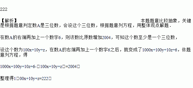 在数A的右端再加上一个数字6,则该数比原数增加2004,那么A=_____.