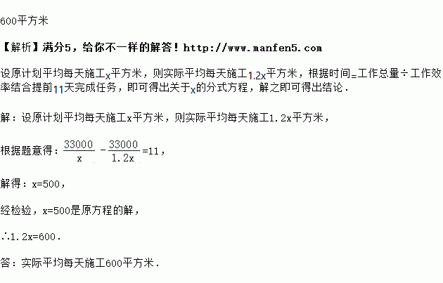 为落实党中央“长江大保护”新发展理念,我市持续推进长江岸线保护,还洞庭湖和长江水清岸绿的自然生态原貌.某工程队负责对一面积为33000平方米的非法砂石码头进行拆除,回填土方和复绿施工,为了缩短工期,该工程队增加了人力和设备,实际工作效率比原计划每天提高了20%,结果提前11天完成任务,求实际平均每天施工多少平方米?