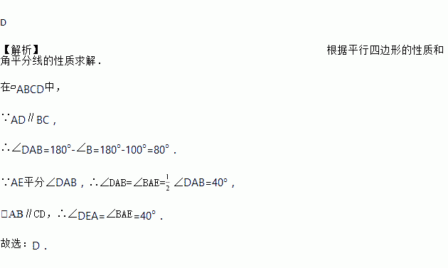 如图,平行四边形ABCD中,AE平分∠DAB,∠B=100°,则∠DEA等于( )