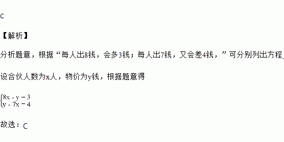 《九章算术》是中国传统数学的重要著作,方程术是它的最高成就.其中记载:今有共买物,人出八,盈三;人出七,不足四,问人数、物价各几何?译文:今有人合伙购物,每人出8钱,会多3钱;每人出7钱,又会差4钱,问人数、物价各是多少?设合伙人数为x人,物价为y钱,以下列出的方程组正确的是( )