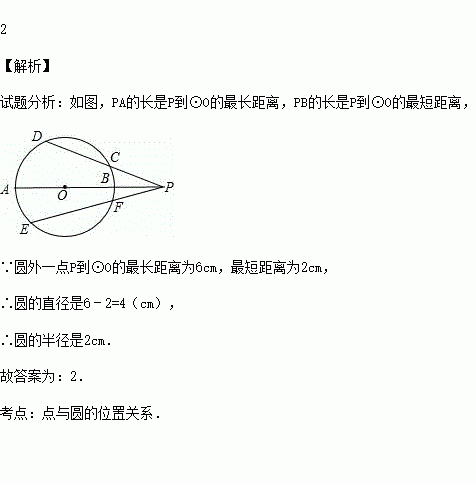 在同一平面上,⊙O外一点P到⊙O上一点的距离最长为6cm,最短为2cm,则⊙O的半径为 cm.
