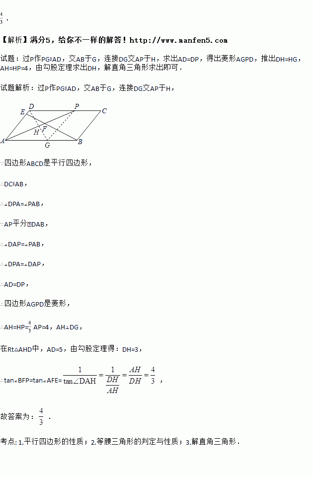 如图,在平行四边形ABCD中,AD=5cm, AP=8cm , AP平分∠DAB,交DC于点P,过点B作BE⊥AD于点E,BE交AP于点F,则tan∠BFP= .