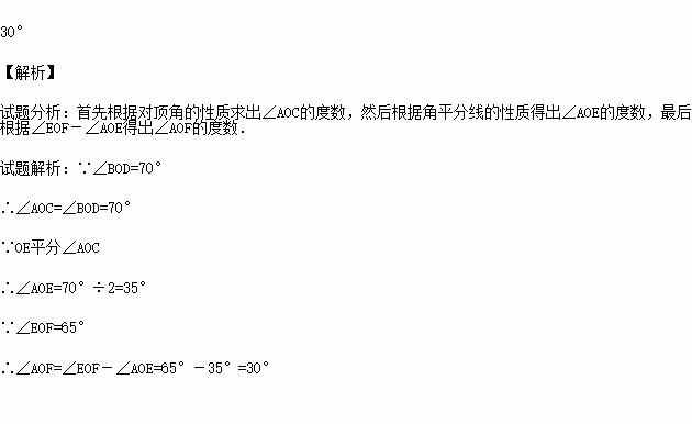 如图,AB、CD相交于点O,OE是∠AOC的平分线,∠BOD=70°,∠EOF=65°.求∠AOF的度数.