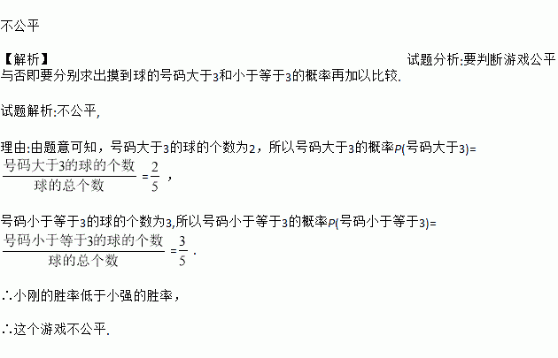 小刚与小强玩摸球游戏,在一个袋子中放有5个完全一样的球,分别标有1、2、3、4、5五个数字,小刚从袋中摸出一球,记下号码,然后放回由小强摸,规定:如果摸到的球号码大于3则小刚胜,否则小强胜,你认为这个游戏公平吗?请说明理由.
