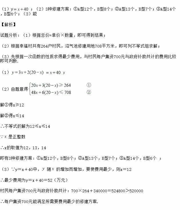 政府相关部门批给该村沼气池修建用地708平方米.设修建A型沼气池x个,修建两种型号沼气池共需费用y万元.