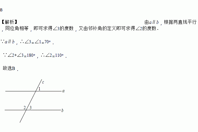已知:如图,直线a,b被直线c所截,且a∥b.若∠1=70°,则∠2的度数是( )