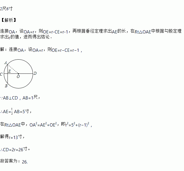 “圆材埋壁”是我国古代著名数学著作《九章算术》中的问题:“今有圆材,埋在壁中,不知大小从锯锯之,深1寸,锯道长1尺,问径几何?”用数学语言可表述为:“如图,CD为⊙O的直径,弦AB⊥CD于E,CE=1寸,AB=10寸,则直径CD的长为_______.