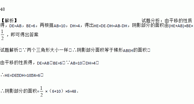 如图所示:两个直角三角形重叠在一起,将其中一个三角形沿着点B到点C的方向平移到△DEF的位置,AB=10,DH=4,平移距离为6,则阴影部分的面积等于________.