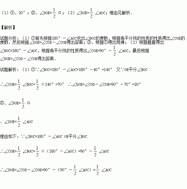 ②、如图1,若∠AOC=α,直接写出∠DOE的度数(用含α的代数式表示);