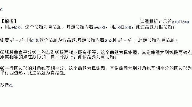 C 【解析】试题解析:①若a>0,b>0,则a+b>0,这个命题为真命题,其逆命题为若a+b>0,则a>0,b>0,此逆命题为假命题; ②若,则a=b,这个命题为假命题,其逆命题为若a=b,则,此逆命题为真命题; ③线段垂直平分线上的点到线段两端点距离相等,这个命题为真命题,其逆命题为到线段两端点距离相等的点在线段的垂直平分线上,此逆命题为真命题; ④平行四边形的对角线互相...