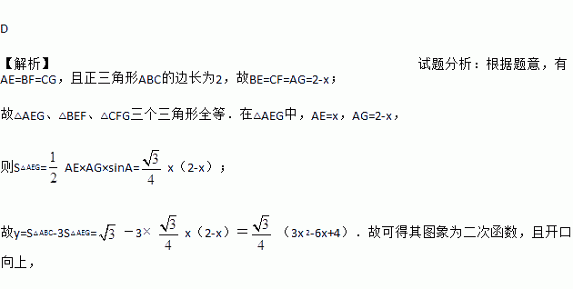 如图,已知正△ABC的边长为2,E、F、G分别是AB、BC、CA上的点,且AE=BF=CG,设△EFG的面积为y,AE的长为x,则y关于x的函数图象大致是( )