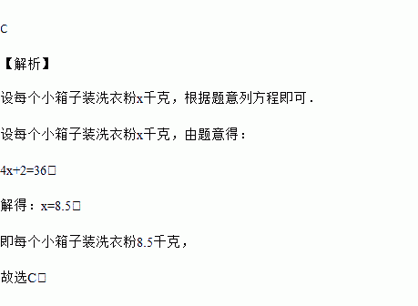 大箱子装洗衣粉36千克,把大箱子里的洗衣粉分装在4个大小相同的小箱子里,装满后还剩余2千克洗衣粉,则每个小箱子装洗衣粉( )