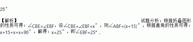 在正方形ABCD中,E为DC边上的一点,沿线段BE对折后,若∠ABF比∠EBF大15,则∠EBF的度数为:________.