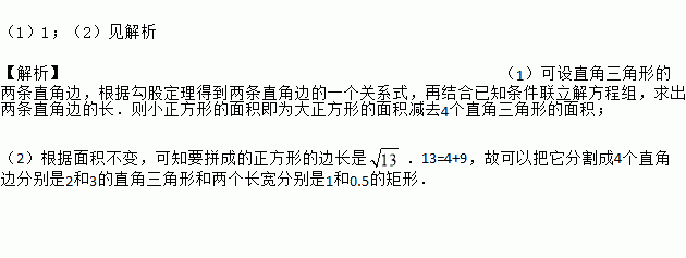 (1)四年一度的国际数学家大会于2002年8月20日在北京召开,大会会标如图1,它是由四个相同的直角三角形与中间的小正方形拼成的一个大正方形.若大正方形的面积为13,每个直角三角形两直角边的和是5,求中间小正方形的面积.