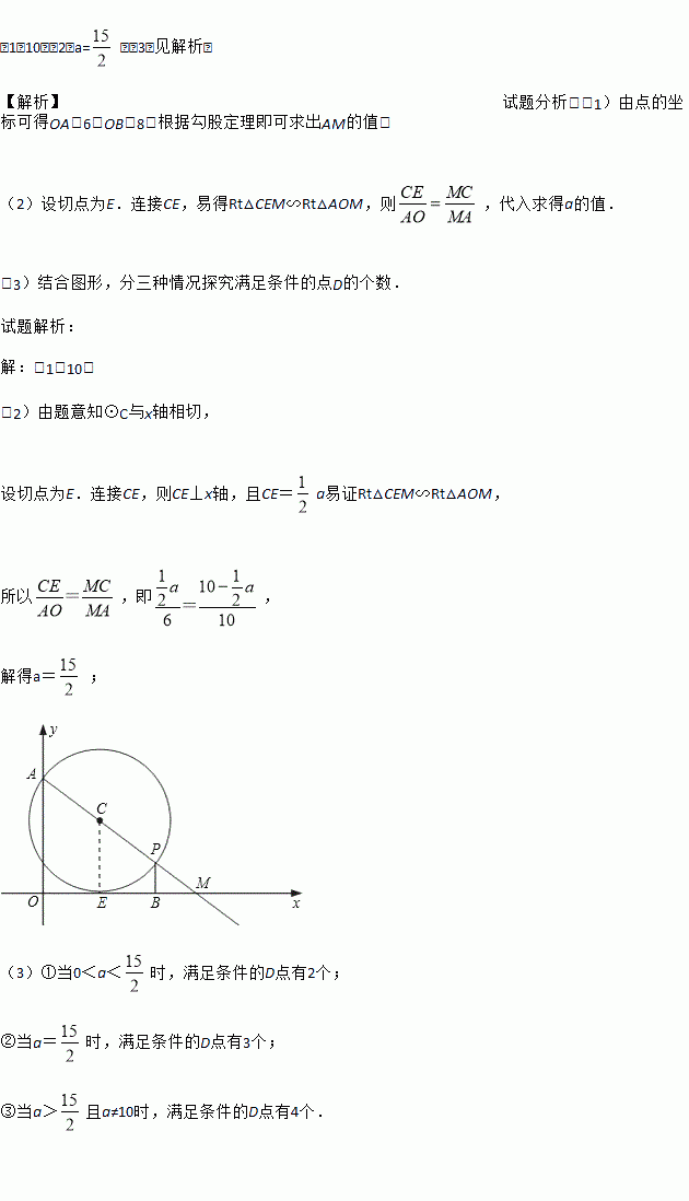 在平面直角坐标系中,A点坐标是(0,6),M点坐标是(8,0).P是射线AM上一点,PB⊥x轴,垂足为B.设AP=a.