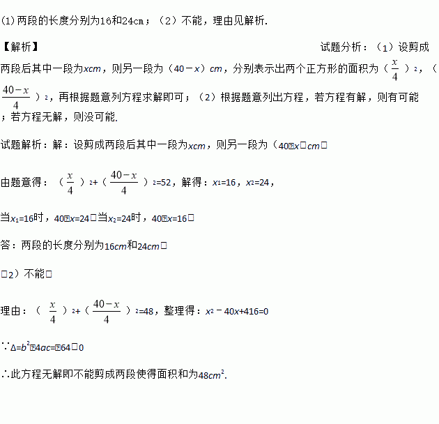 (1)两段的长度分别为16和24cm;(2)不能,理由见解析. 【解析】试题分析:(1)设剪成两段后其中一段为xcm,则另一段为(40-x)cm,分别表示出两个正方形的面积为()2,( )2,再根据题意列方程求解即可;(2)根据题意列出方程,若方程有解,则有可能;若方程无解,则没可能. 试题解析:【解析】 设剪成两段后其中一段为xcm,则另一段为(40﹣x)cm, 由题意得:...