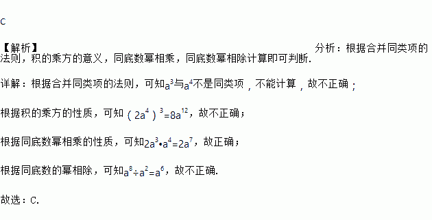 A. a3+a4=a7 B. (2a4)3=8a7 C. 2a3•a4=2a7 D. a8÷a2=a4