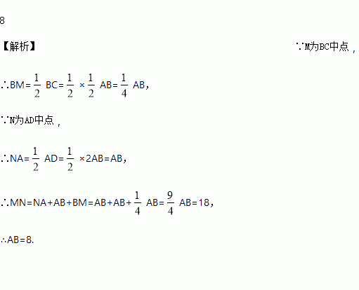 已知线段AB,延长AB到C,使得BC=AB,延长BA到D,使得AD=2AB,M,N分别为BC,AD的中点,若MN=18 cm,则AB=______cm.