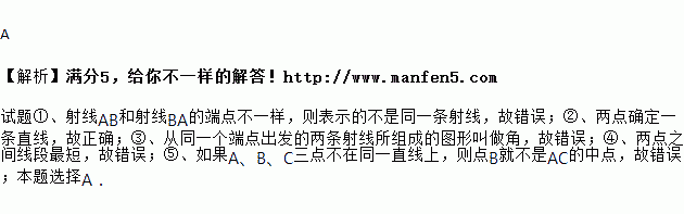 ①射线AB与射线BA是同一条射线;②两点确定一条直线;③两条射线组成的图形叫做角;④两点之间直线最短;⑤若AB=BC,则点B是AC的中点.