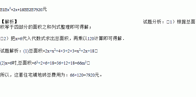 (2)若铺1平方米地砖平均费用120元,求当x=6时,这套住宅铺地砖总费用为多少元?