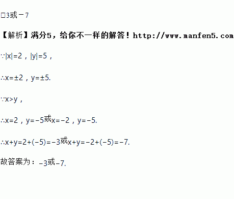 已知|x|=2,|y|=5,且x>y,则x+y=_____.