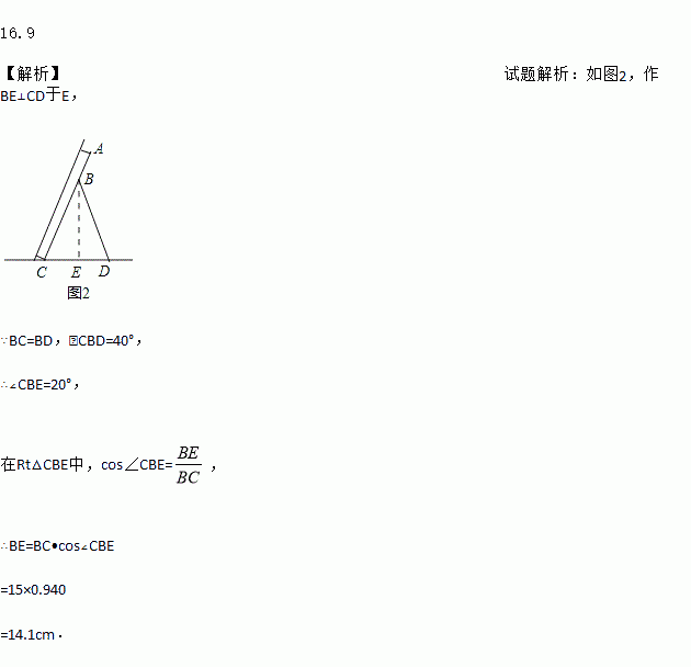 如图1是小红同学书桌上的一个电子相框,将其侧面抽象为如图2所示的几何图形,已知BC=BD=18cm,∠CBD=40°,则点B到CD的距离为________ cm(用科学计算器计算.参考数据sin20°≈0.342,cos20°≈0.940,sin40°≈0.643,cos40°≈0.766,结果精确到0.1cm).