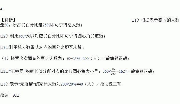 (2)在扇形统计图中,“不赞同”的家长部分所对应的扇形圆心角大小为162°