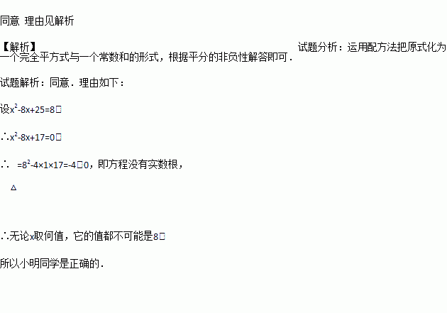 对于二次三项式x2-8x+25,小明同学得到如下结论:无论x取何值,它的值都不可能是8.你是否同意他的说法?请你说明理由.