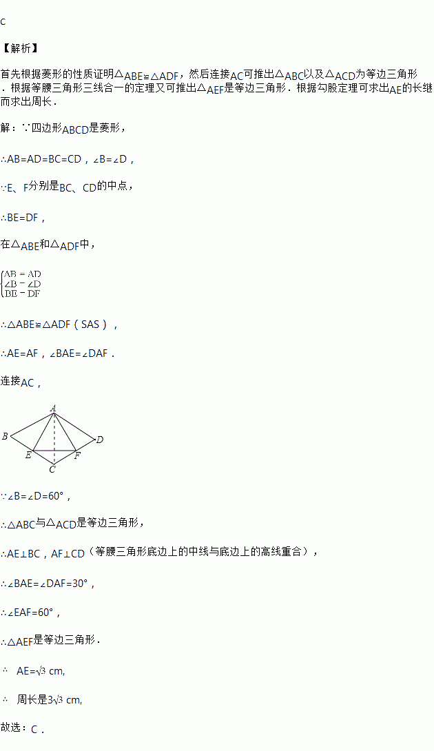 如图,菱形ABCD中,∠B=60°,AB=2cm,E、F分别是BC、CD的中点,连结AE、EF、AF,则△AEF的周长为( )