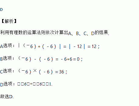 A. |(﹣6)+(﹣6)| B. (﹣6)﹣(﹣6) C. (﹣6)×(﹣6) D. (﹣6)÷(﹣6)